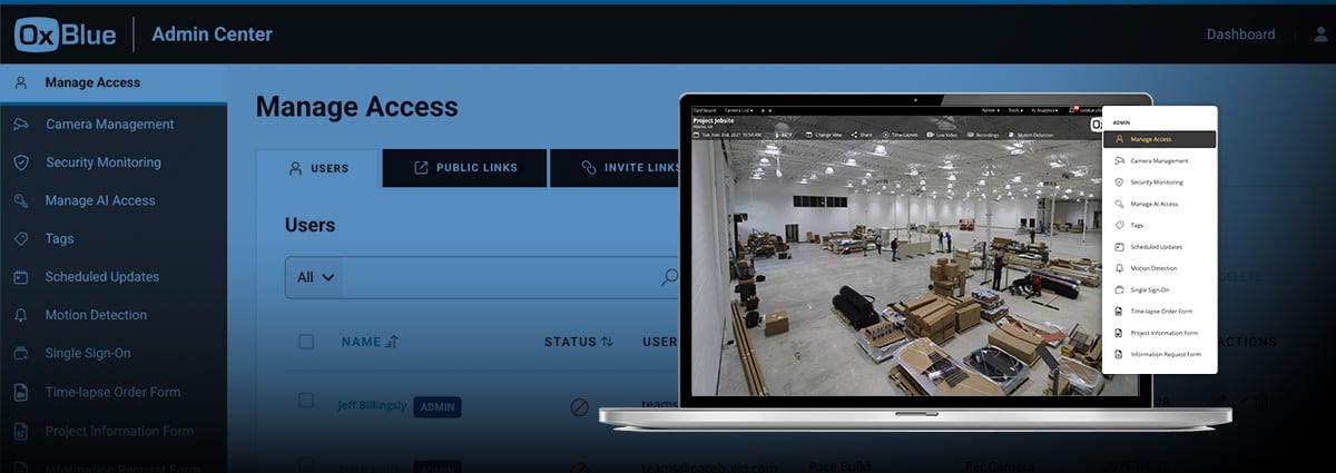 Clear permissions keep teams efficient. When every user has the capability to adjust views or schedule recurring updates; views can become inconsistent and inboxes cluttered with extra updates. OxBlue’s web-app allows Admins to easily manage access for every construction camera in the network. Admins can: